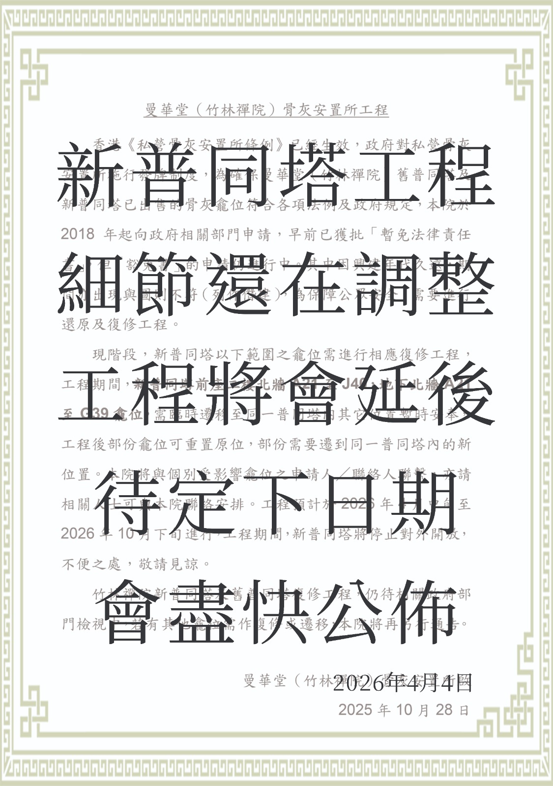 骨灰龕及祖先堂:早上八時半至下午四時正